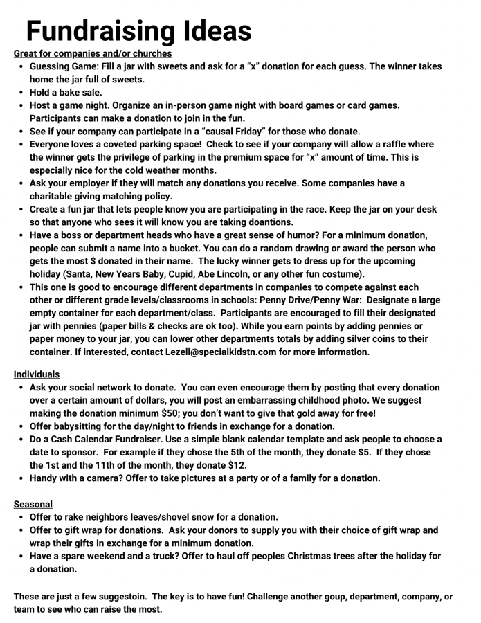 If you choose to fundraise as a team the impact just intensifies. It can be as simple as sharing on your social media platforms that you are fundraising. Other ideas include holding a garage sale or a bake sale and having the proceeds go to Special Kids. If you work at an office and management agrees, have everyone donate $5 and have a casual dress day. If you work in a large office, consider doing a "penny war" between departments for bragging rights. The possibilities are endless! Every step and every dollar matter!
